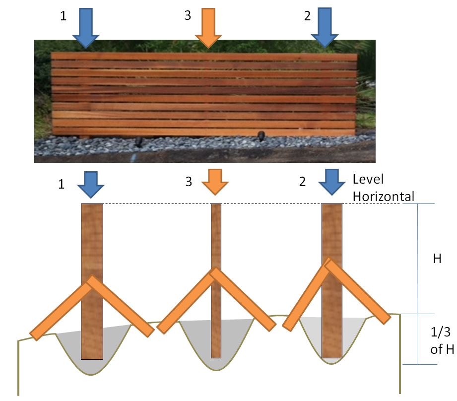 4. Place the 2 X 4″x4″ at location 1 and 3 and the 2″x4″ at location 3. Keep in mind the 2″X4″ has the narrow side facing forward. Using scrap wood and stakes support each beam leveled vertically and horizontally. At this point is helpful to have a helper. Make sure you level every thing a support each beam in all directions, this point is critical otherwise your fence will not be straight.