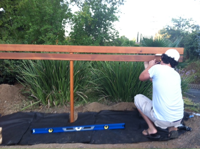 7. At this point you should be ready to start attaching your cedar to the 3 beams. I would recommend you start from the top and make sure that “1×4″ beam is level and set .25″ to .5″ above the the top of the vertical beams. This will help to make sure the fence looks truly horizontal when you look at it from the front.