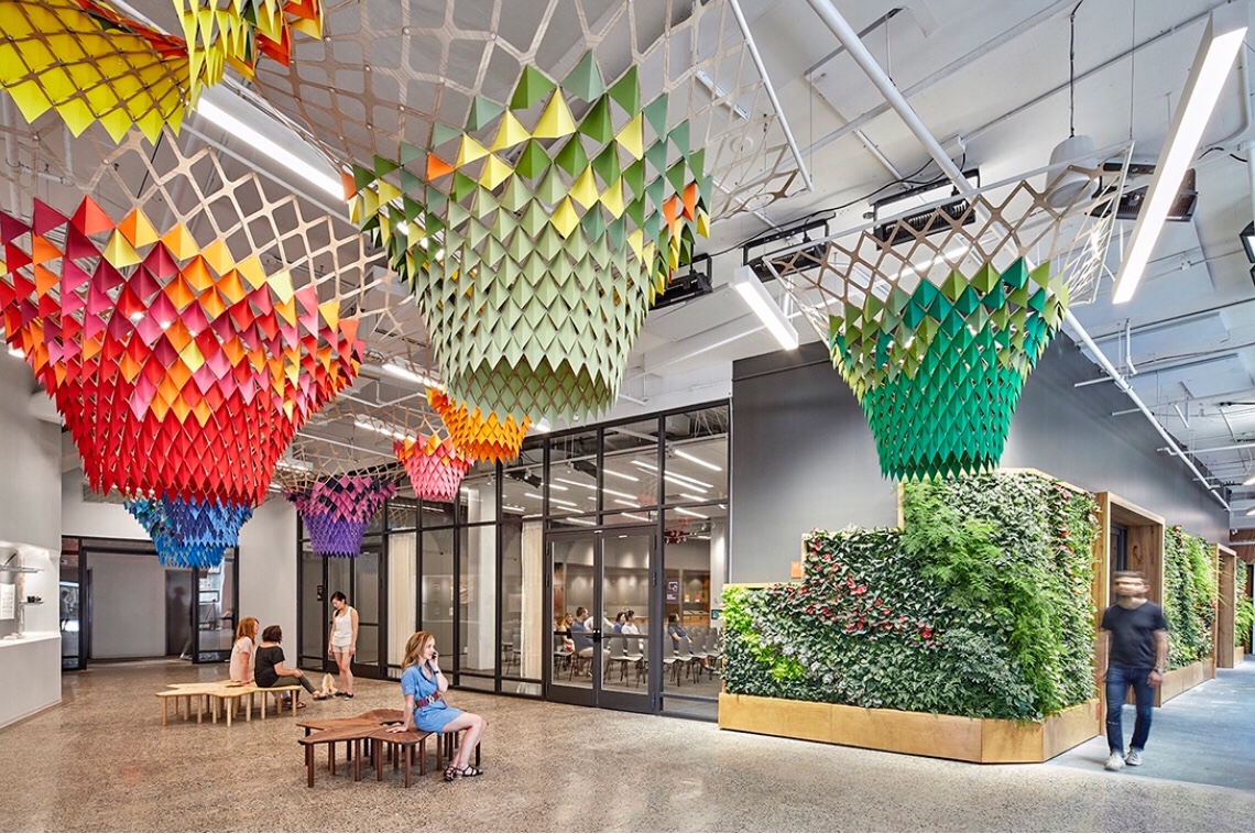 Etsy offices as expected show a great mix between bright color patterns and green foliage (see wall). I am sure this combination nurtures relaxing feelings as you walk by the corridors.